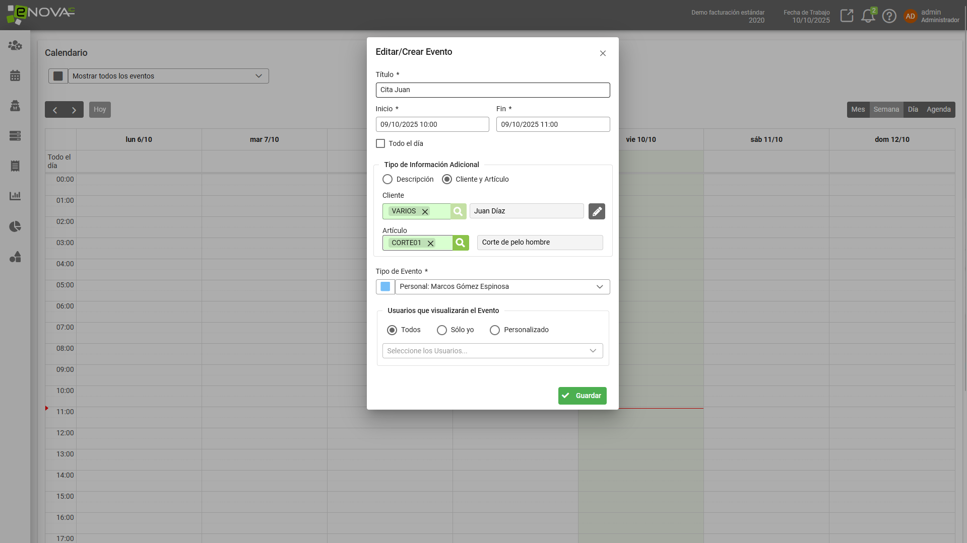 Un calendario extendido dentro de tu software para planificar con contexto: cada evento puede llevar cliente, artículo/servicio y responsable, con tipos y filtros para trabajar rápido y con claridad.