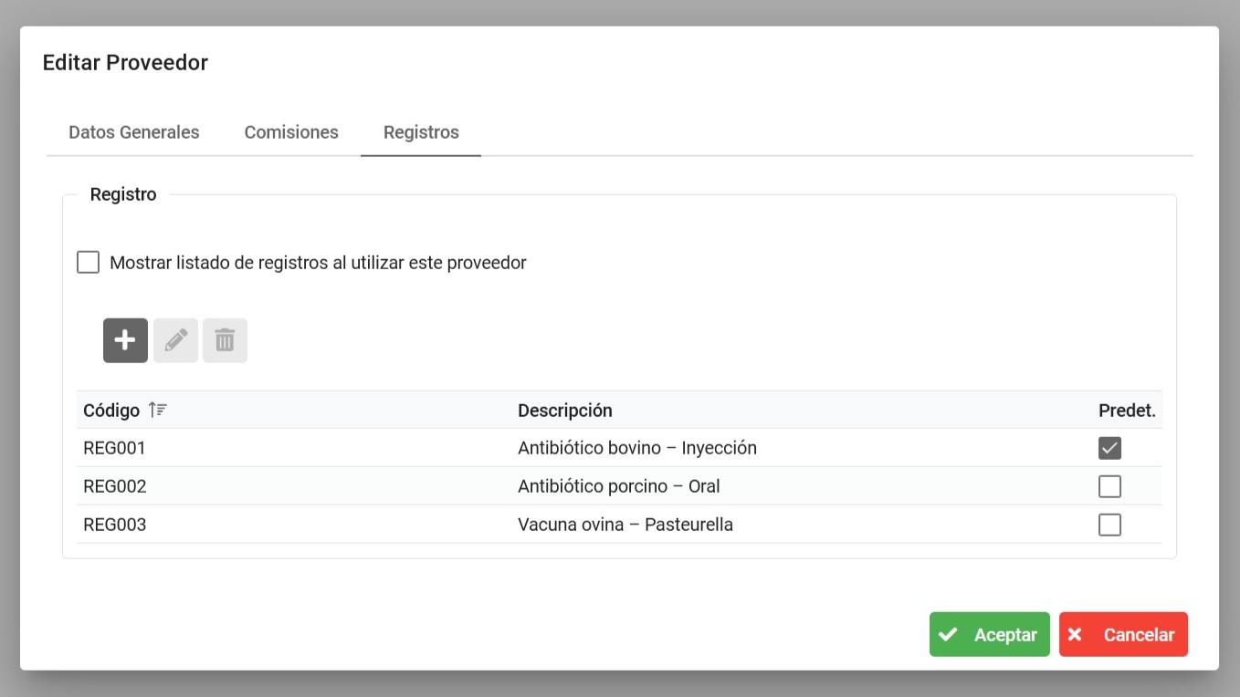 Cada proveedor puede tener varios registros según el tipo o la zona de distribución, y es posible establecer un registro por defecto para automatizar las operaciones habituales.